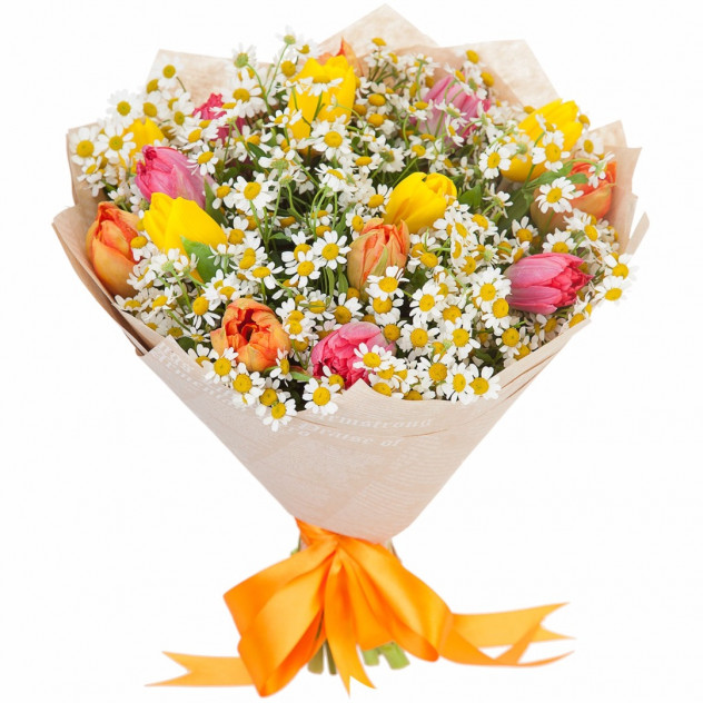 Состав: Упаковка для букета: крафт-бумага, Тюльпан 15шт., Матрекария 10шт.