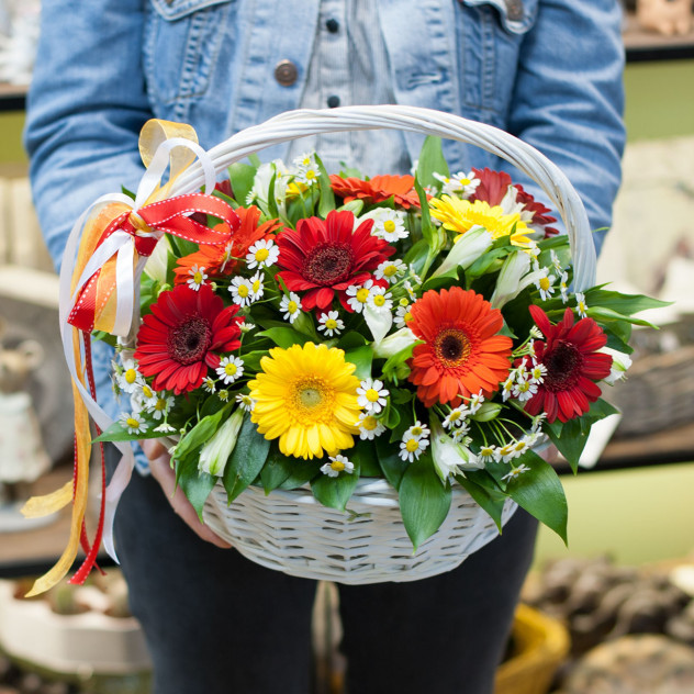 Корзина из минигербер красного, оранжевого, желтого цветов 11 шт, ромашек 3 шт, альстромерий белых 3 шт, рускус 15 шт, декоративные ленты 3 шт.